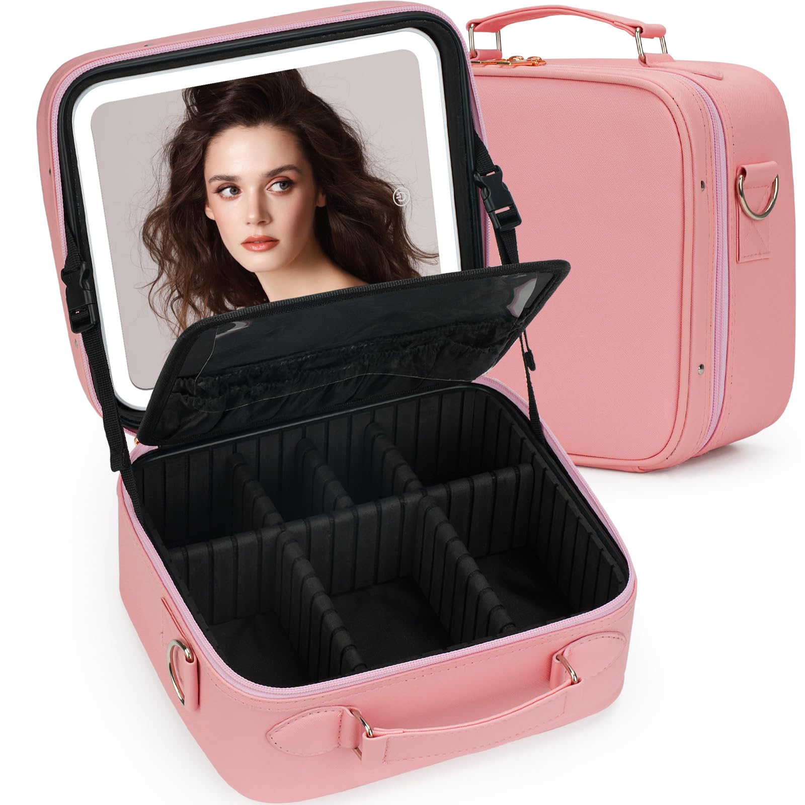 ViKert Travel Makeup Bag with Light Up Mirror,Makeup Travel Case with adjustable dividers,Waterproof Makeup Train Case,lighted Makeup Case with Detachable Mirror
